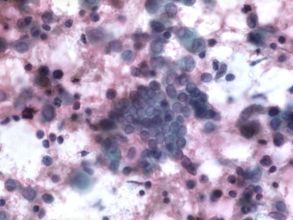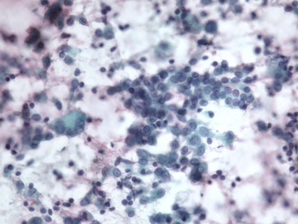Little evidence of hyperthyroidism was present other than the chronic inflammation since the patient had been under treatment for several months prior to sampling. Flame cells, cytoplasmic aggregates of mauve material, can be seen on Romanowsky stained smears in cases of Grave’s disease, but we only had Papanicolaou stained material. Lymphocytes are commonly found on aspirates of the thyroid in hyperthyroidism and suggest a relationship with Hashimoto’s thyroiditis.