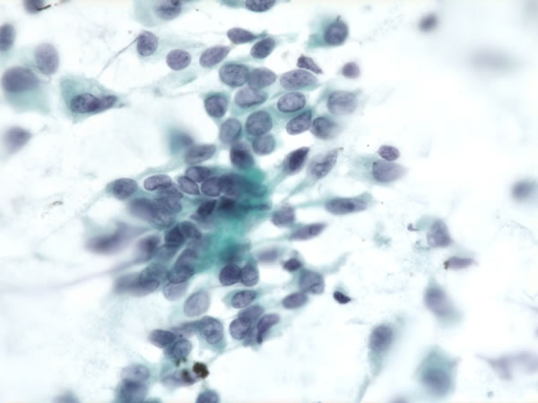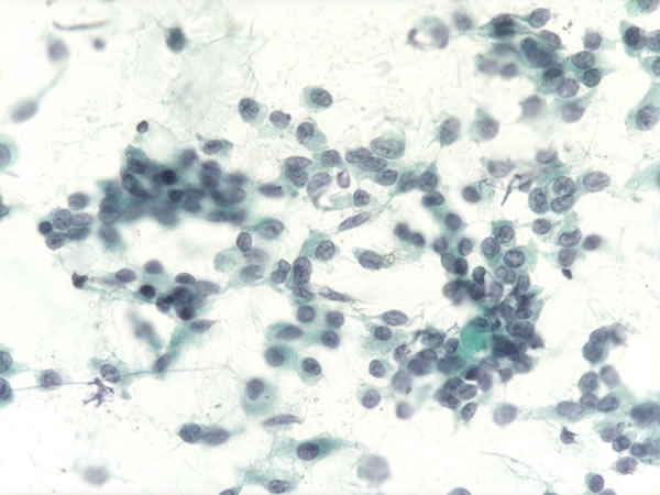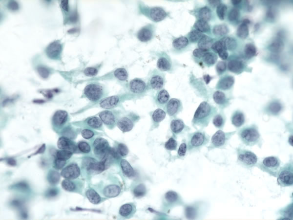 Although the nuclear morphology of the tumor cells on cytology in this case have many features suggestive of papillary carcinoma, their frequent presence as single cells, an uncommon finding in papillary carcinoma, and their occasional plasmacytoid appearance, as well as the scattered fragments of extracellular material raised the possibility of medullary carcinoma. A cellblock was not available on which to perform immunohistochemical staining for thyroglobulin and calcitonin. However, medullary carcinomas are invariably associated with elevated serum calcitonin that can be easily measured.