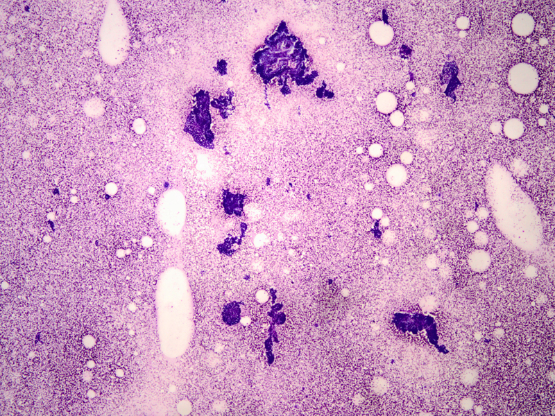 - Thin proteinaceous debris, histiocytes and apocrine cells may be seen