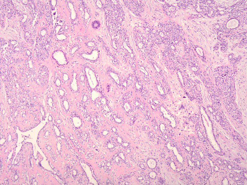 - Fibroadenoma: can be confused with tubular variant of adenomyoepithelioma; staghorn epithelial groups and fibrillary (rather than dense stroma in adenomyoepithelioma) stroma (11).